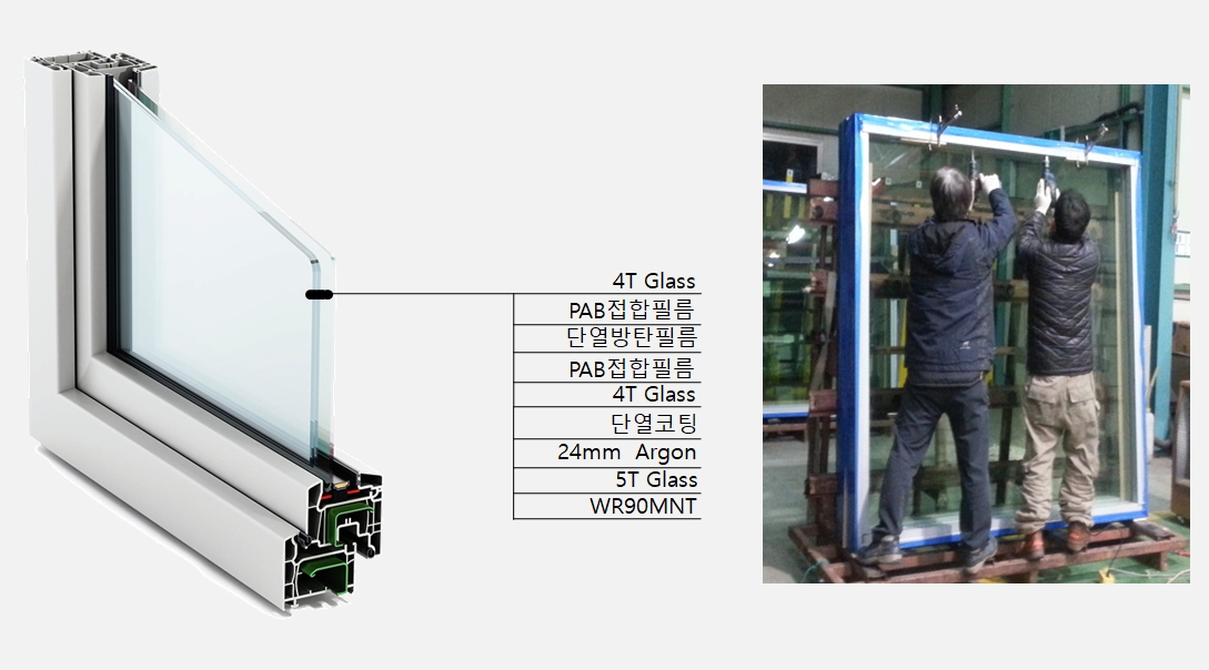 유리 사이에 넣는 관통 방지 필름에 다층 코팅을 하여 단열, 방탄 기능을 주게 되었습니다.