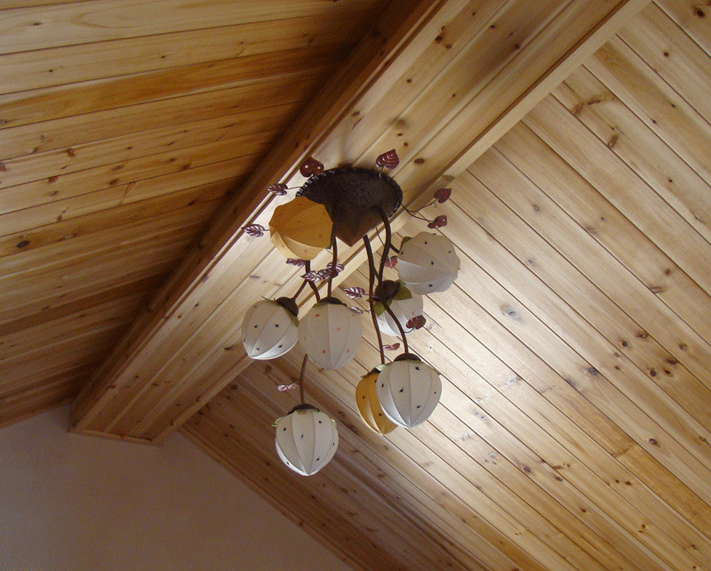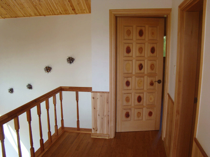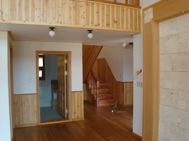 높은 거실천정과 벽난로가 있는 전원 주택 거실에 대나무 마루와 아트월 그리고 자연을 닮은 조명으로 내부 인테리어를 마무리하고 방분은 예술가의 작품과 같은 원목도어를 사용하였습니다.