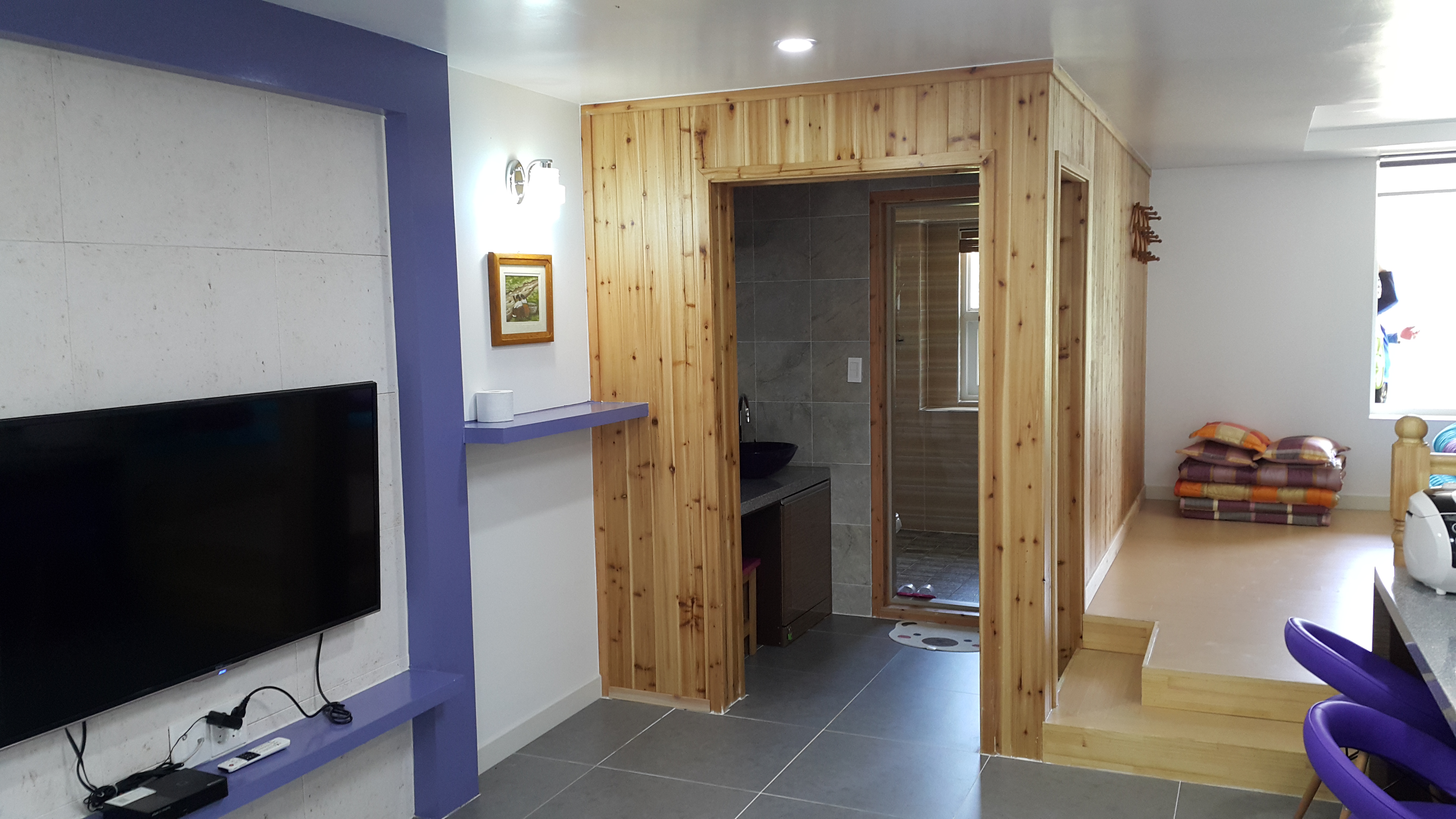 화장실과 연결된 파우더룸을 별도로 설치 하였고 , 침실은 바닥보다 40cm 높여서 침대를 넣아 원룸이지만 거실과 침실이 분리 된 공간을 만들었습니다.